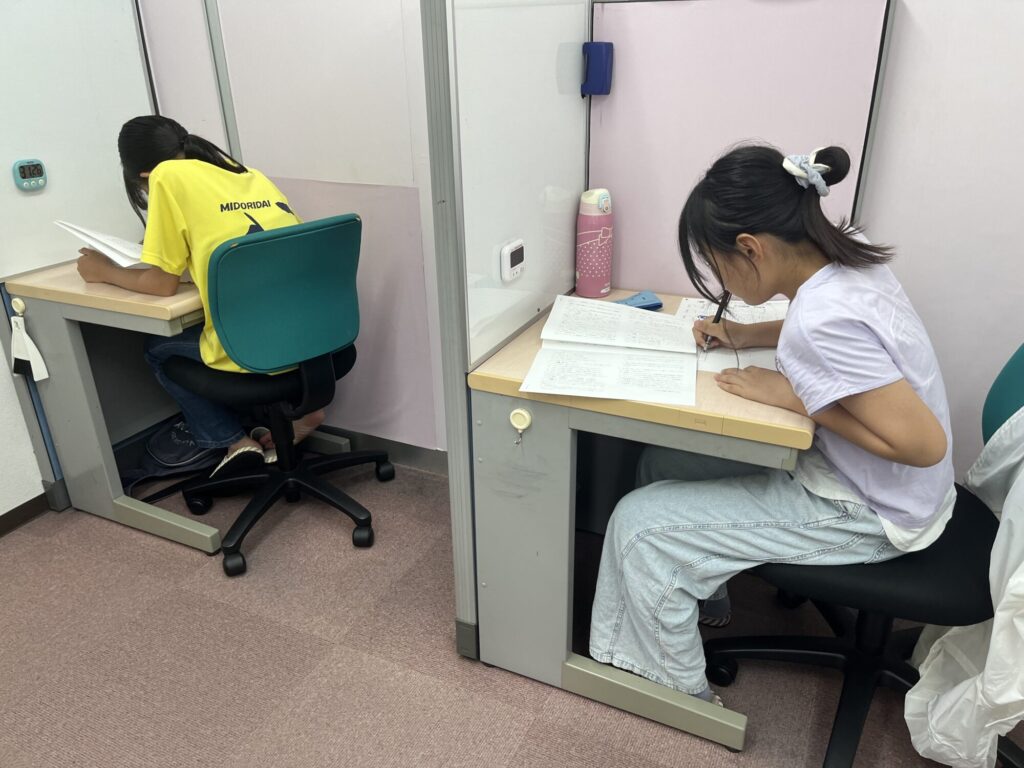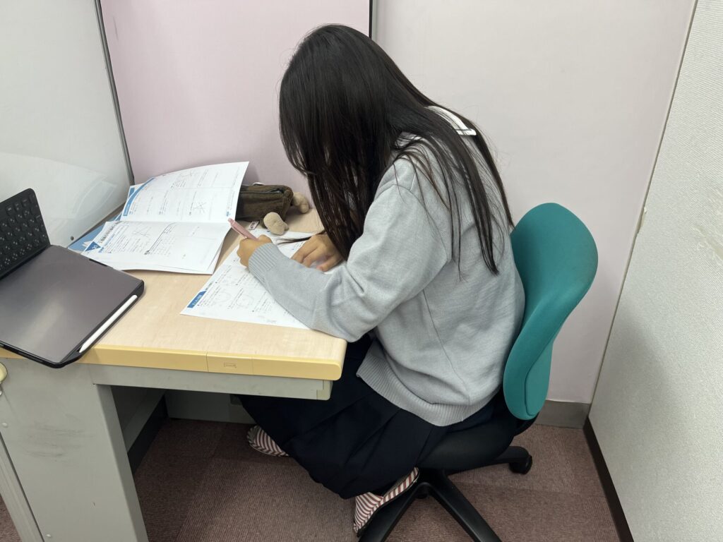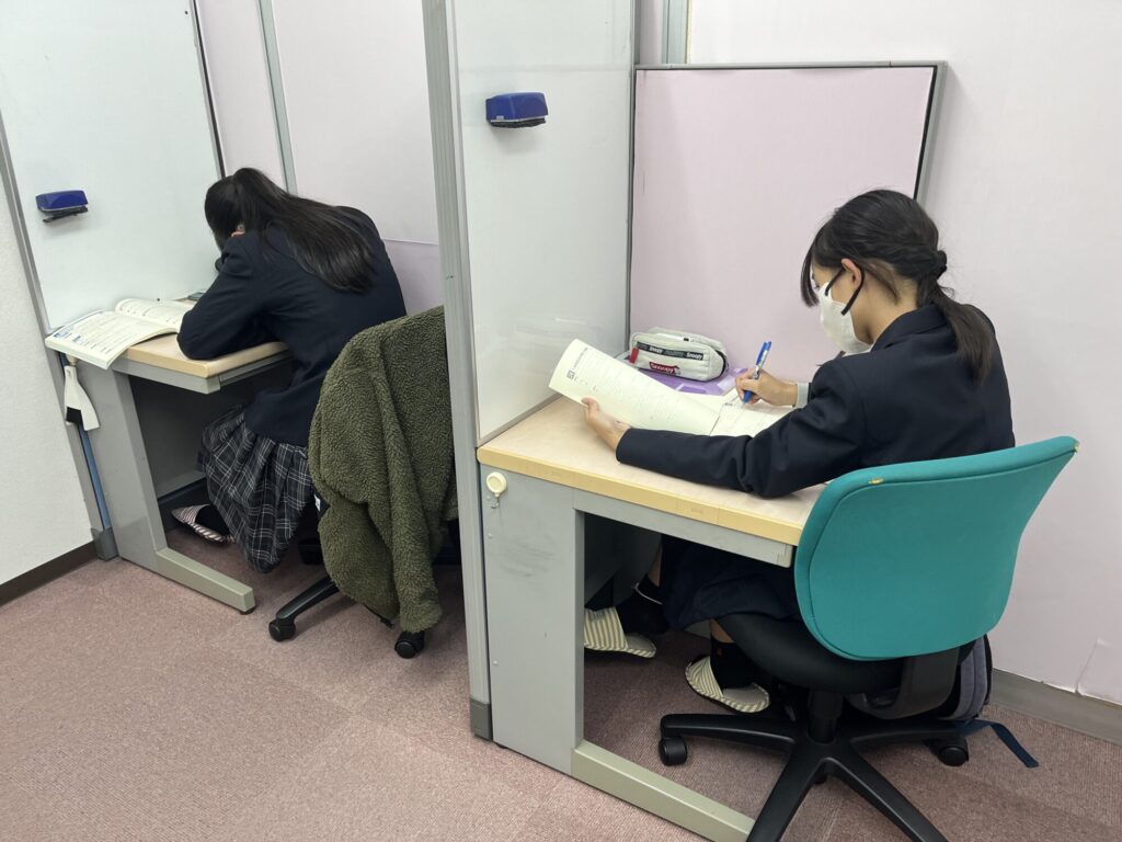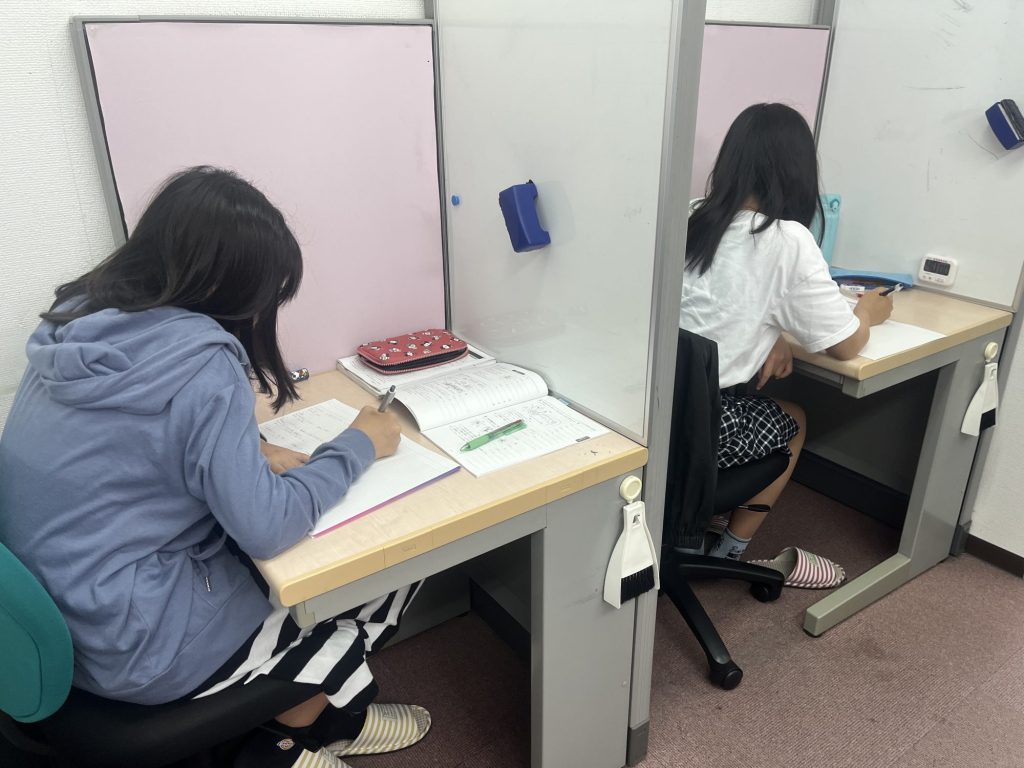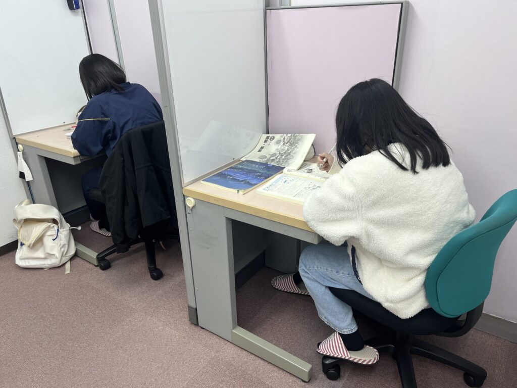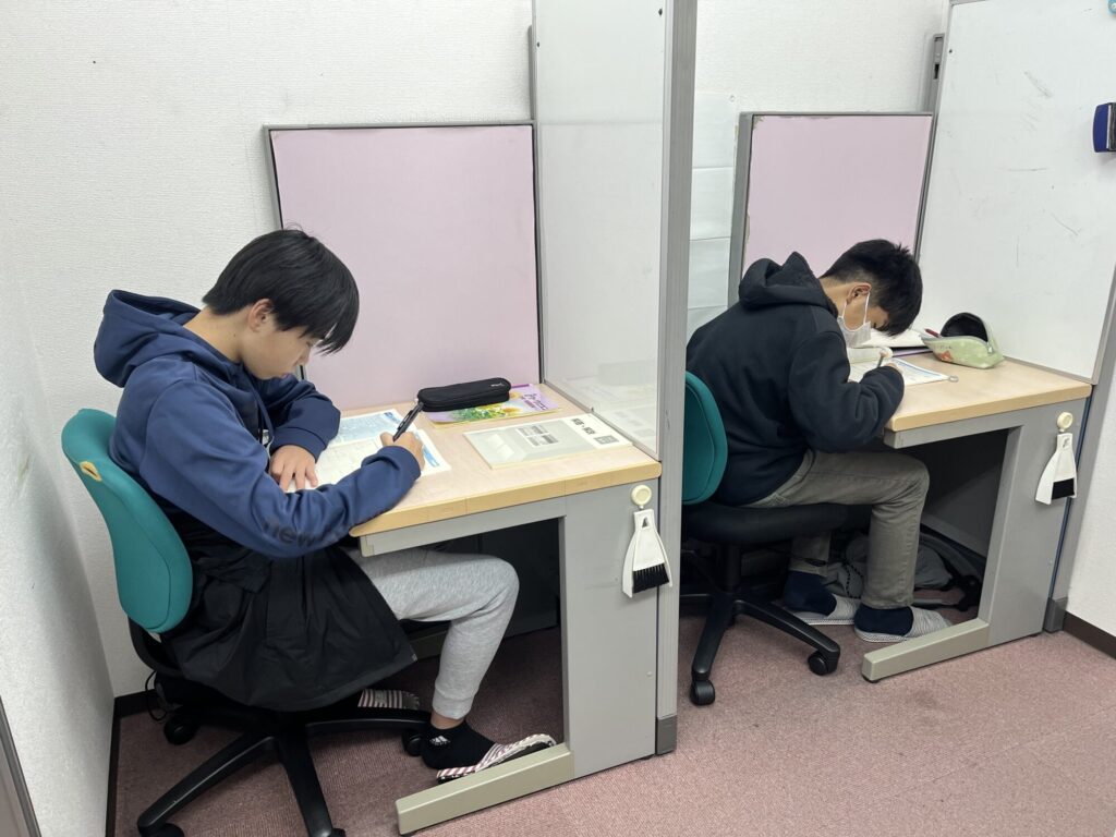 個別教室です。間仕切りは教室の状況に応じて変更できます。落ち着いた雰囲気での学習です。楽しく質問・相談できます。